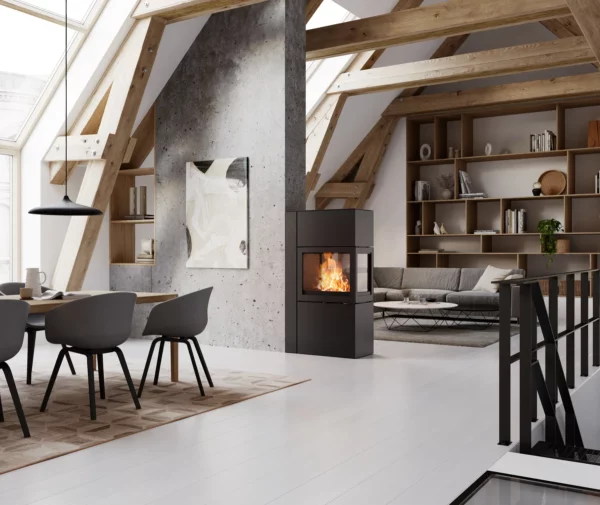 Le poêle à bois Attika 600 RD n’est pas qu’un simple appareil de chauffage — c’est un véritable élément architectural. Sa forme rectangulaire moderne et ses larges vitres panoramiques en font un séparateur d’espaces haut de gamme, créant une connexion visuelle chaleureuse entre deux pièces.